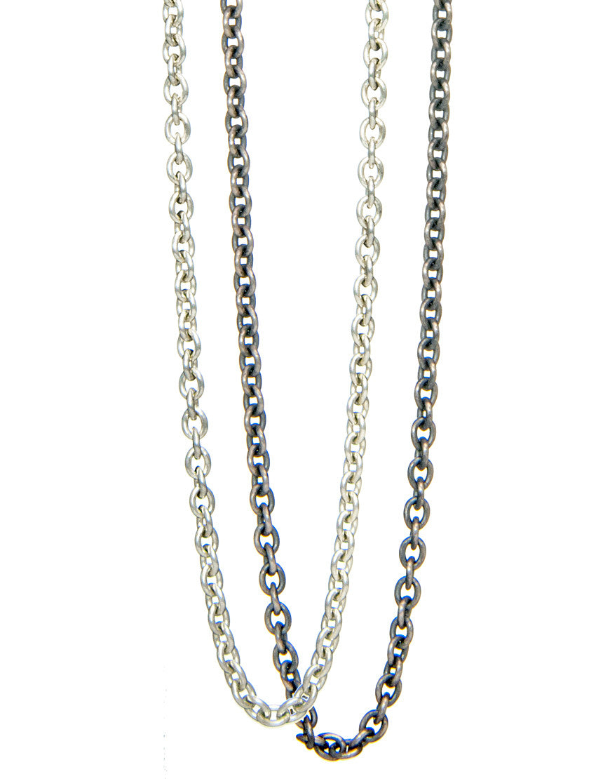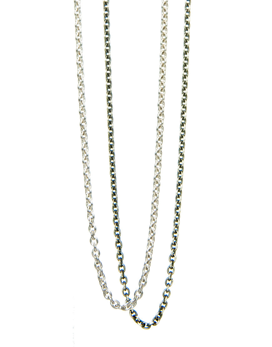 Die Ankerkette gibt es in drei verschiedenen Durchmessern von 3mm, 2mm und 1,5mm. Wähle zwischen zwei verschiedenen Oberflächenfarben aus, entweder silber oder silber antik (patiniert). Jede Ausführung der Ankerkette kannst du in unserem Eins Berlin Onlineshop in sechs unterschiedlichen Längen kaufen.