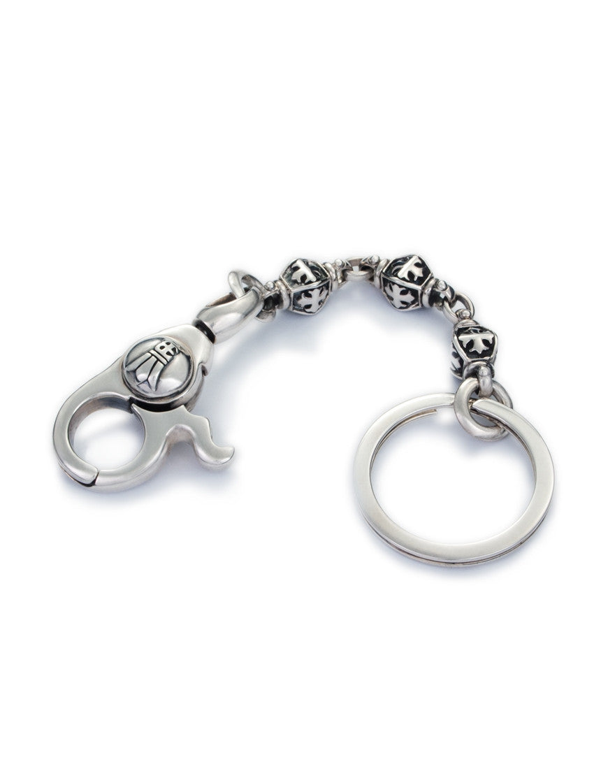 Schlüsselkette mit einem wunderschönem, sehr griffigen Karabinerhaken und aufwendig gestalteten Gliedern, die von der französischen Lilie (Fleur-de-Lys) geziert sind. Aus Sterlingsilber gearbeitet und mit einer leicht patinierten Oberfläche versehen. Der Schlüsselring ist aus langlebigem Chromstahl.